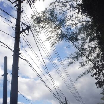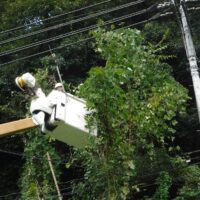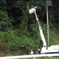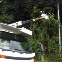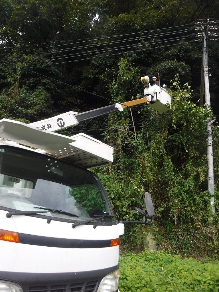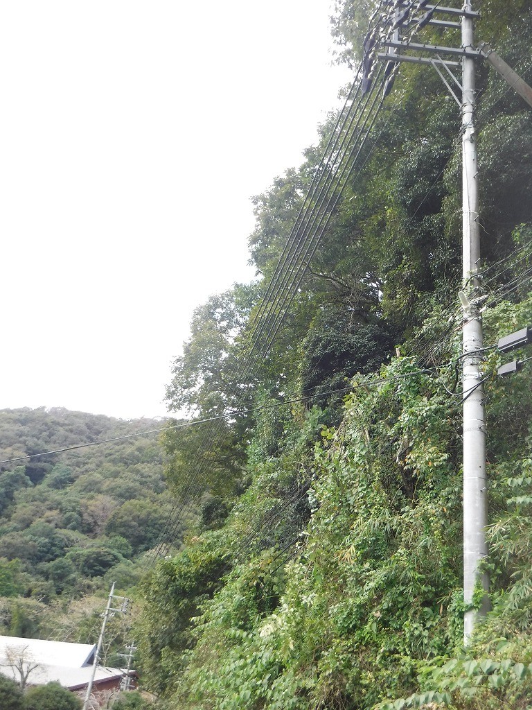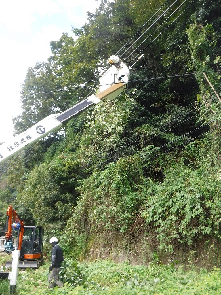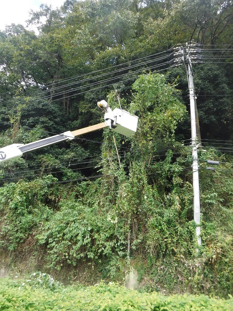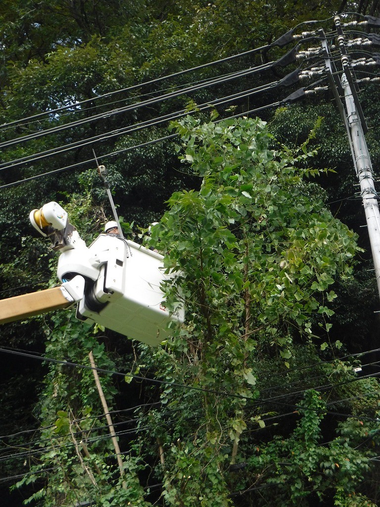 弊社では配電線の保全のための伐採をしています。電線に近い枝が出てきたら、枝払いしたり、芯切りにして電線に当たらないようにします。変圧器などの設備と架線の接合部への木の枝の接触は漏電の原因となります。電線の被覆と木の枝がこすれて被覆が傷んでしまい、漏電の原因となることもあります。ひどいときは発火・断線に至ります。今回の場所は岡山市北区建部町吉田です。