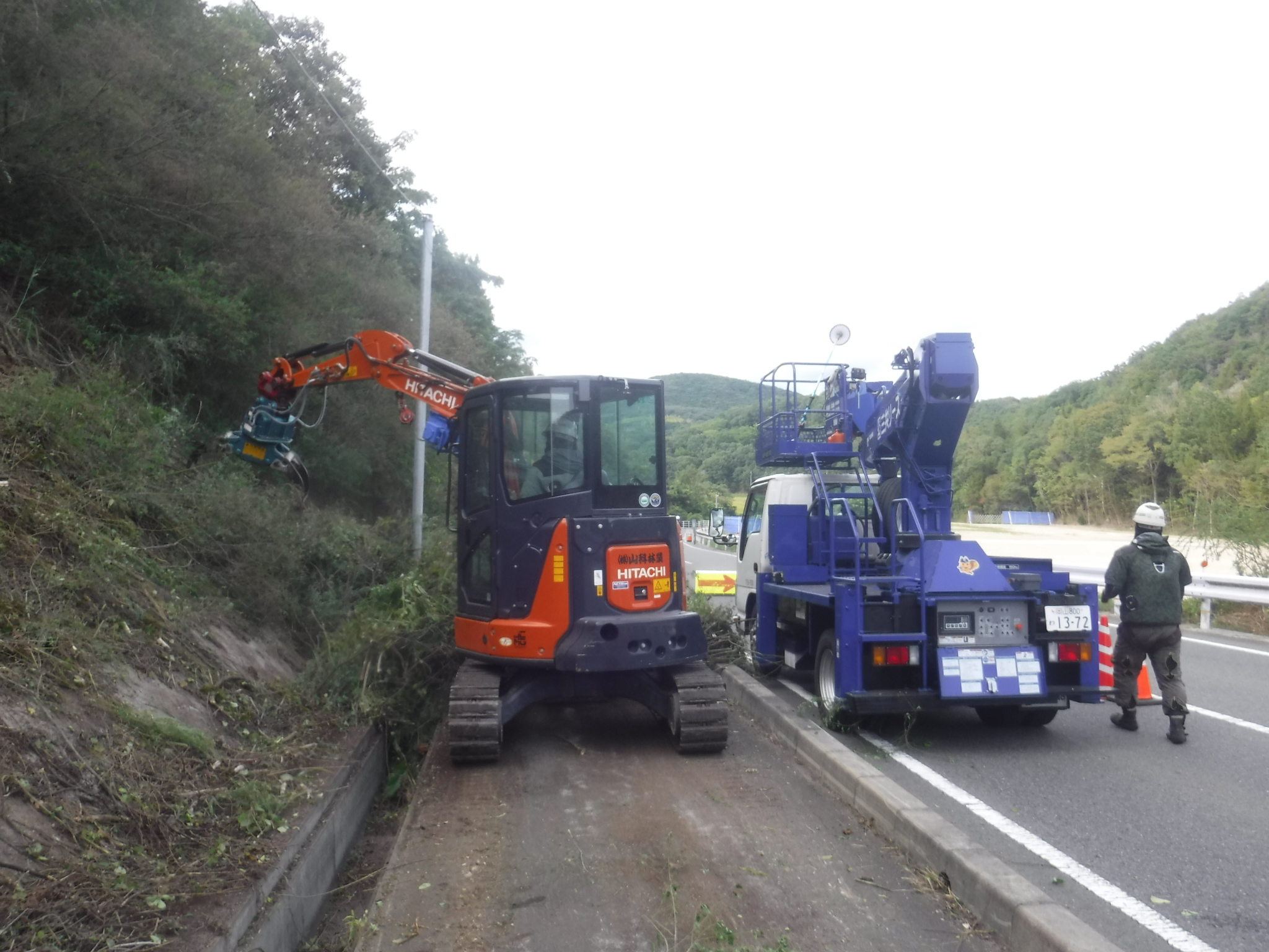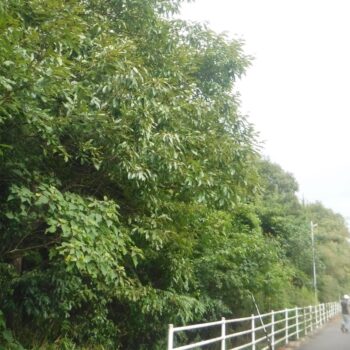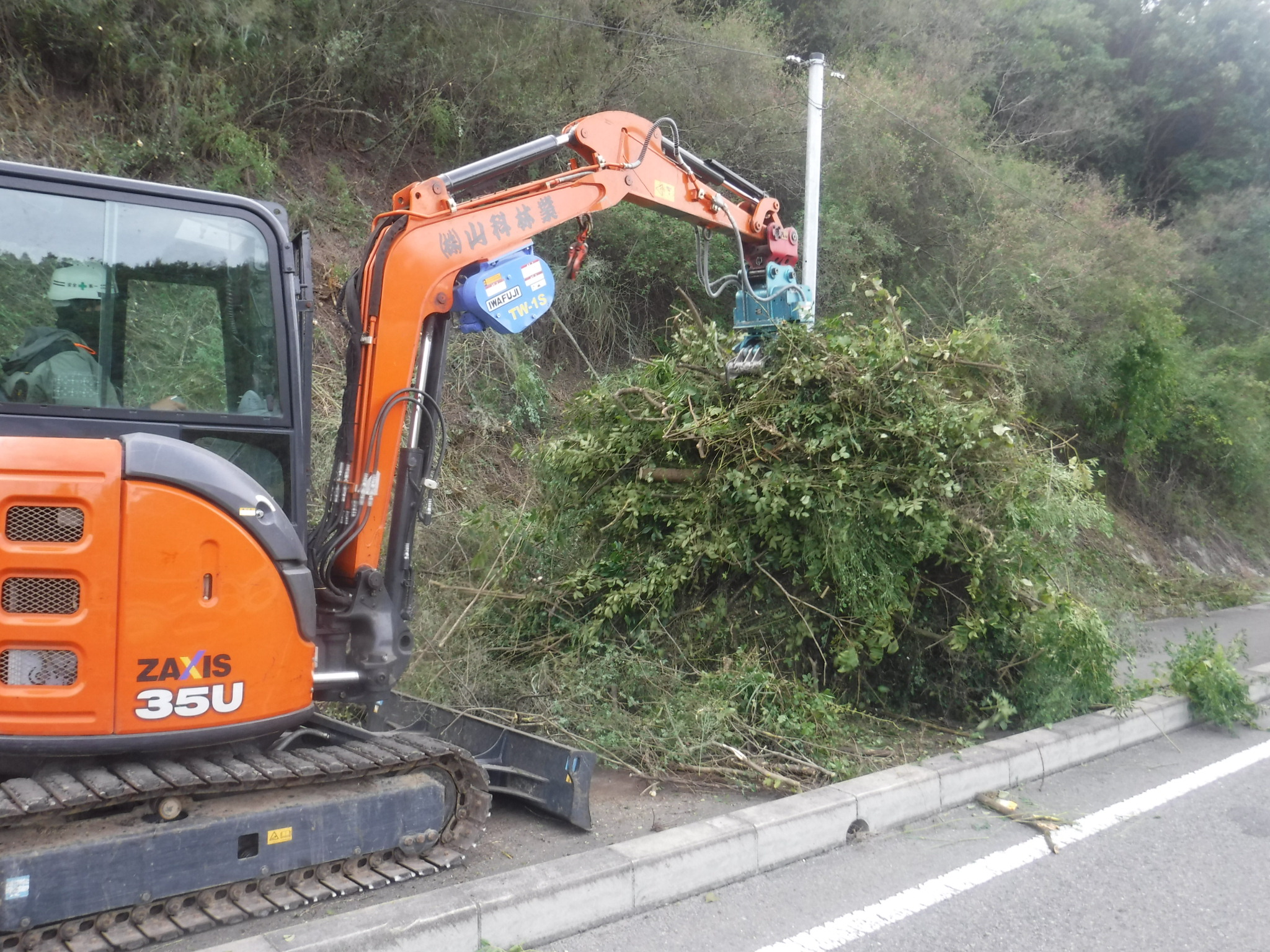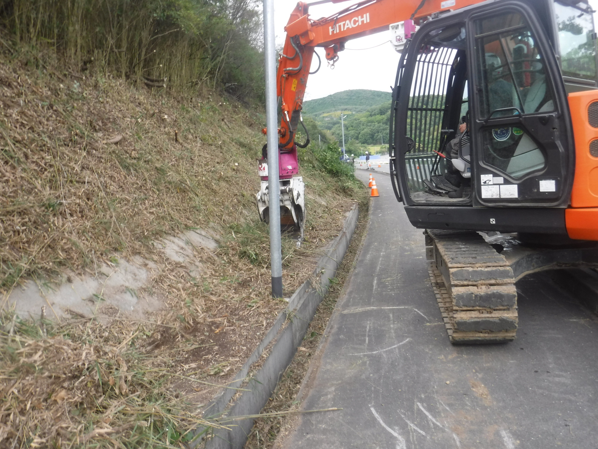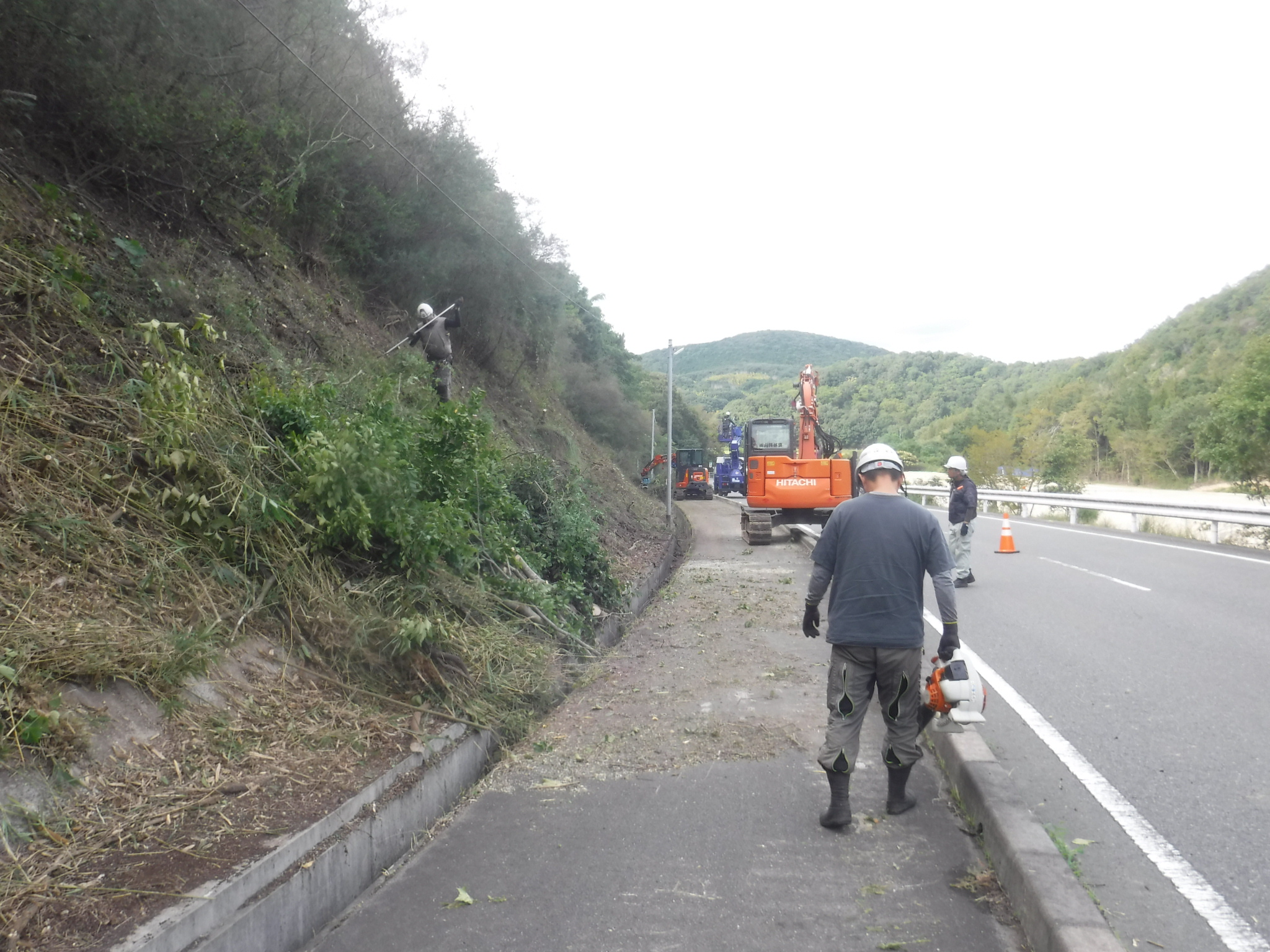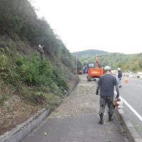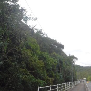 ↑上の写真は新設線端部の地面が道路より一段低い場所で、支障木を芯切りで残している箇所の前後写真です。NTTの架線が見えますが、電気の線はこれの5mくらい上に来ます。